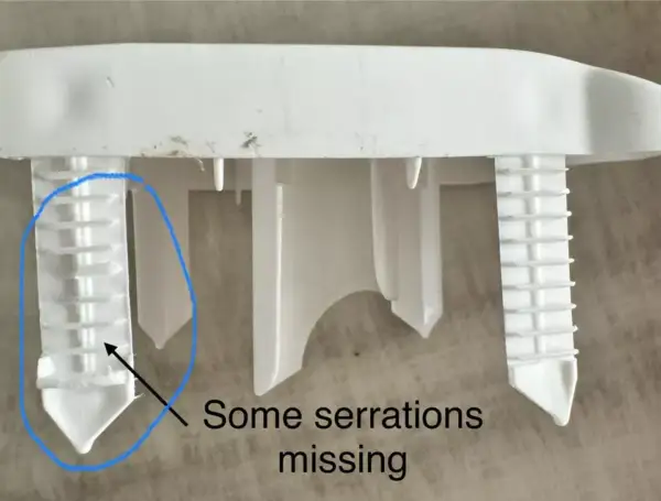 One of the side cover pictures highlights missing serrations, which we’ve tried to clearly show. Photos include both fully assembled and disassembled views of the dispenser.